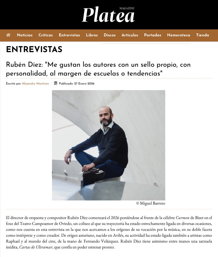«El músico Rubén Díez dirige la orquesta que acompañará al cantante en la gira internacional que comienza el miércoles en el Teatro Real de Madrid. El músico avilesino Rubén Díez será en los próximos meses la batuta de Raphael. El consagrado cantante inicia mañana miércoles en Madrid una gira de conciertos acompañado de orquesta, y será Díez el que dirija a los músicos».